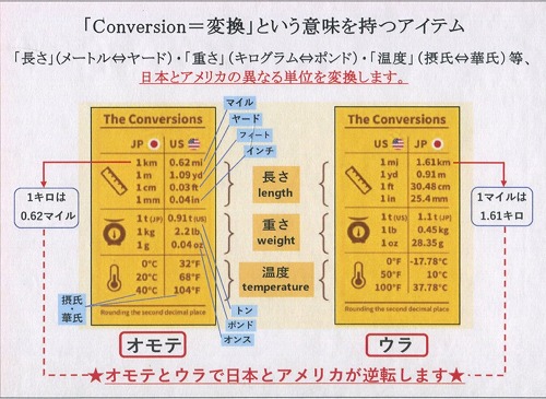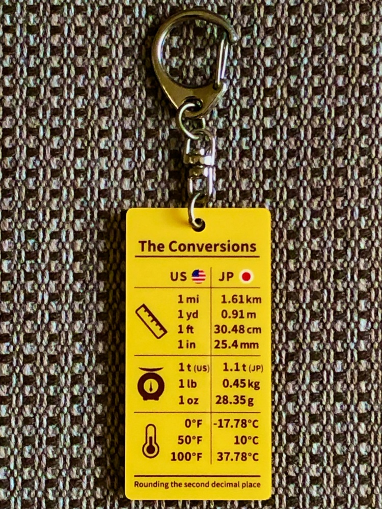 「Conversion=変換」という意味を持つアクリルキーホルダーです。長さ(メートル⇔ヤード)・重さ(グラム⇔ポンド)・温度(摂氏⇔華氏)といった、日本とアメリカの異なる計測単位を変換し、小さなアクリル板で表現しました。表面は日本→アメリカ、裏面はアメリカ→日本となり単位の基準が逆転します。