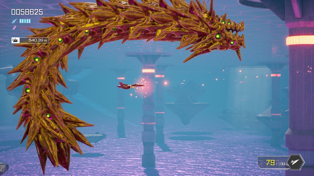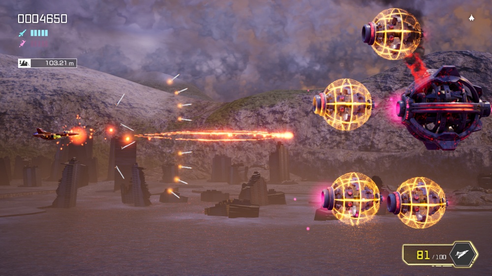 プレイヤー機は、残存エネルギーが続く限り、地上・空中を問わずリアルタイムに変形が可能。